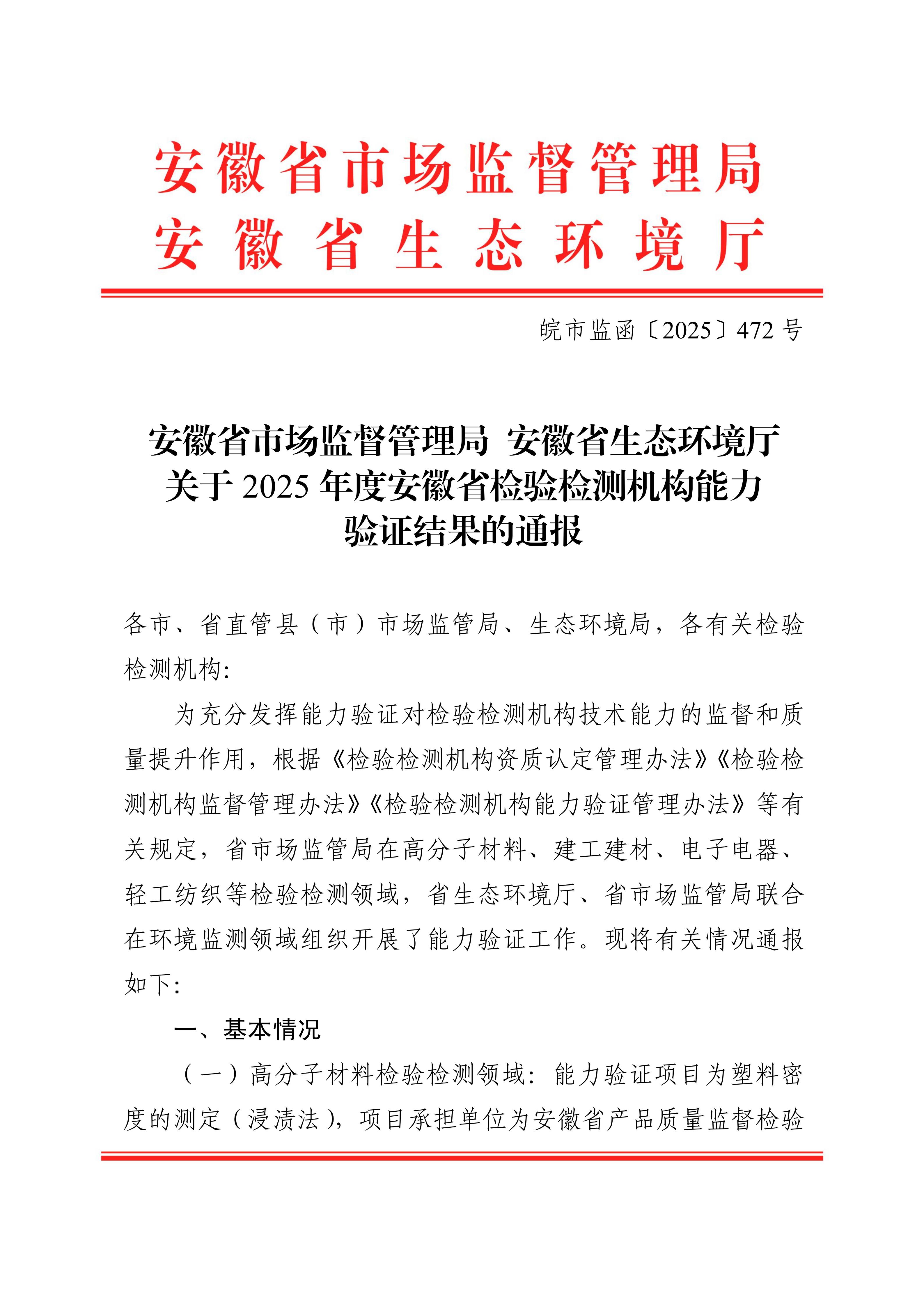 近日,安徽省市場監督管理局、安徽省生態環境廳聯合發布了《2025年度安徽省檢驗檢測機構能力驗證結果的通報》。安徽寰宇工程質量檢測有限公司在高分子材料、建工建材兩個檢驗檢測領域的能力驗證中,均取得“合格”結果,充分展現了公司過硬的技術實力和可靠的質量管理能力。 ...
